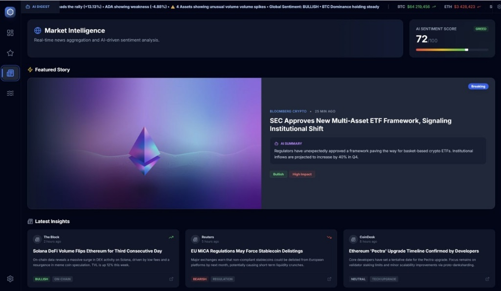 - Impact Filtering: The AI reads the news for you, assigning a status (Bullish/Bearish) and filtering for “High Impact” stories—such as the SEC approving a new ETF framework—ensuring the trader focuses only on market-moving events.