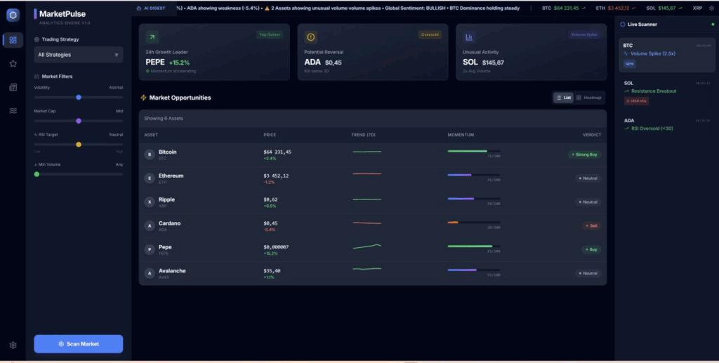 MarketPulse processes the market state through a unified interface that eliminates the need to open ten different tabs. Instead of boring tables, the platform utilizes heatmaps, sparklines, and impulse speedometers to visualize data.