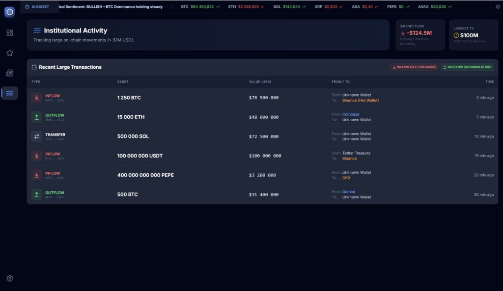Retail traders watch charts; institutional traders watch liquidity. The Whale Watch module gives MarketPulse users an edge by monitoring transactions over $1 million to reveal what institutional players are doing on-chain.