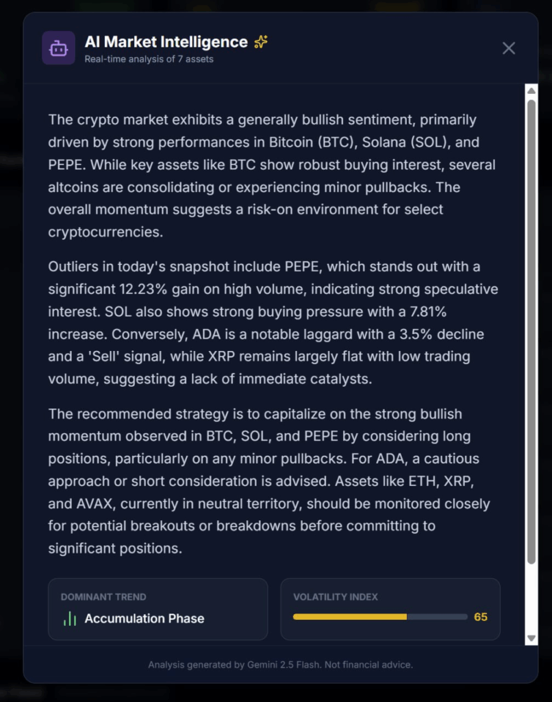 - Outlier Analysis: The AI automatically flags standouts, such as PEPE showing a 12.23% gain, and contextualizes it as “speculative interest” rather than organic growth.